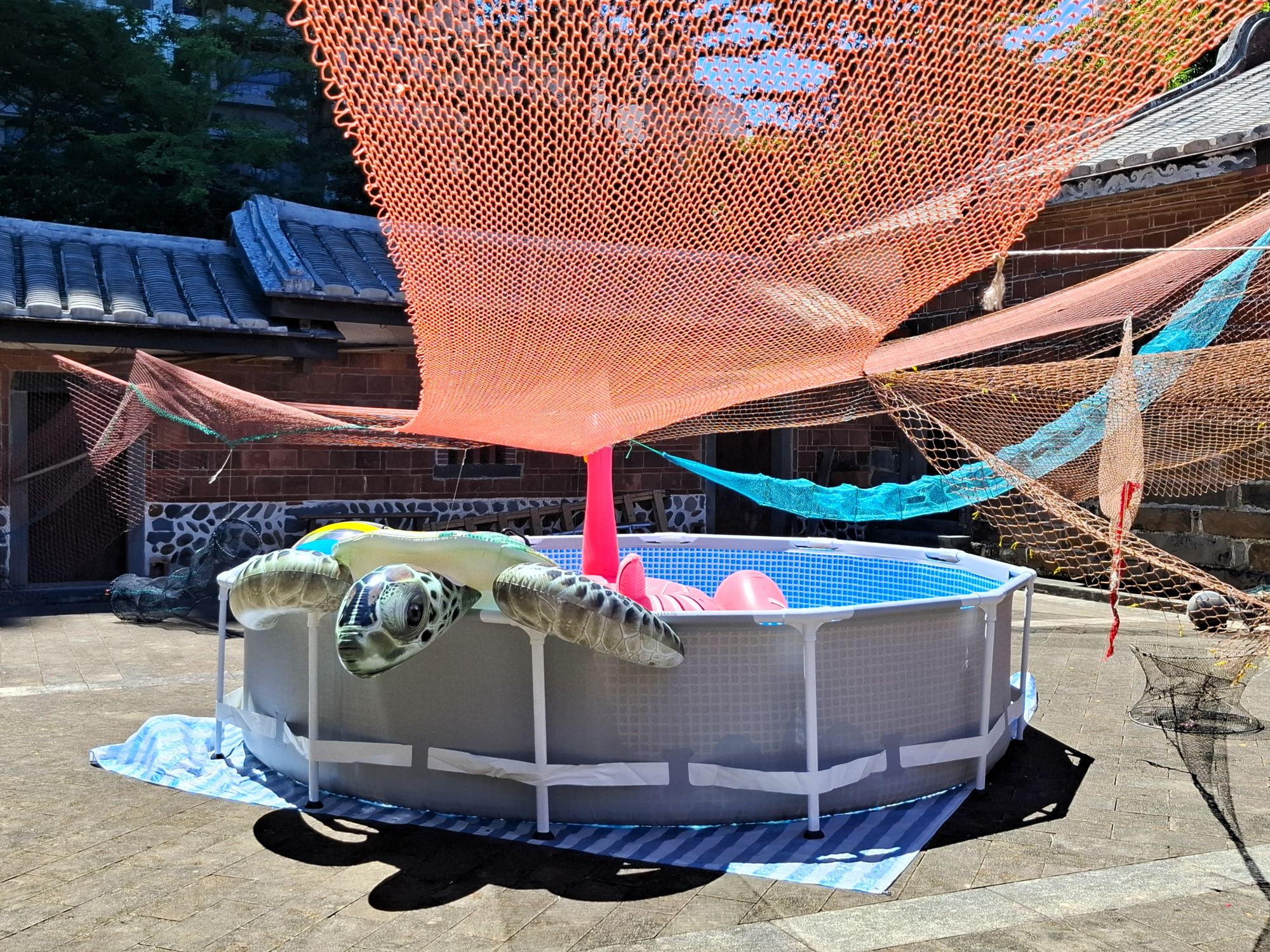 藝術家王毓淞在古厝三合院日曬大埕設置親子游泳池,想呼應三芝玉堂釣蝦場與海水養殖場,裝進北海岸無盡的海水意象,召喚離海與故鄉的笑聲回歸。在泳池裡,人們與家人、與海龜共游,象徵生命繁衍與自然共生的願景。王毓淞曾於基隆外木山與海龜同游,此次訪談的文史工作者周正義老師也憶起童年在養殖池邊與海龜共游的經驗。作品以此提醒著:海龜從未遠去,只要轉變心念,海龜終將被我們召喚回來。